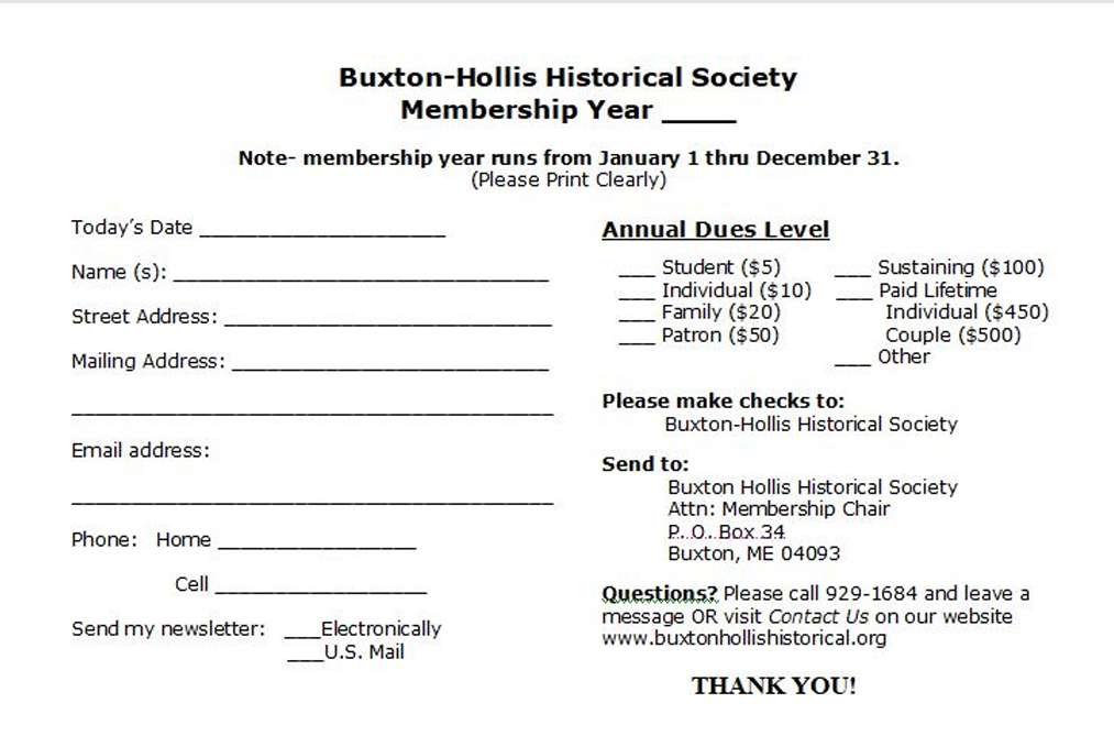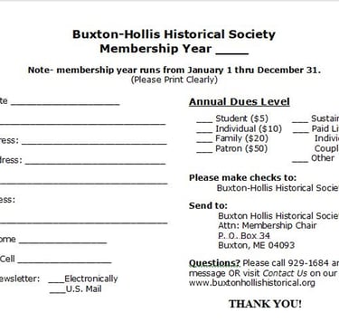 We invite your support by becoming a member of the Society! Complete and send in the form below for 2026 Membership. Mail to: Buxton-Hollis Historical Society, P.O. Box 34, Buxton, Maine 04093